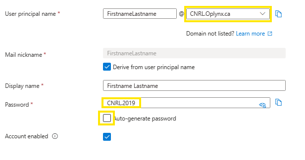 Password - Uncheck "Auto-generate password", set password as Company in CAPS followed by .2019 as below: