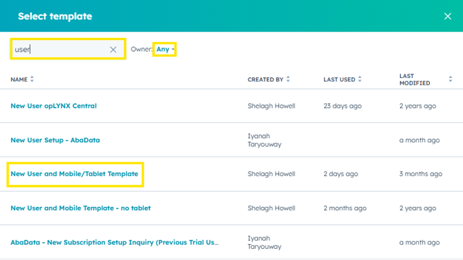 In the email, click Templates. Make sure Owner is set to Any. You will most commonly use New User and Mobile/Tablet Template.