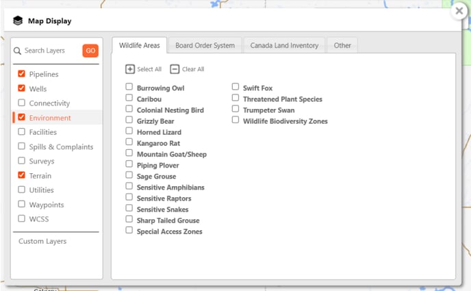 Select the Environment layer to view Wildlife areas, Board Order Systems, Canada Land Inventory, or other environmental information