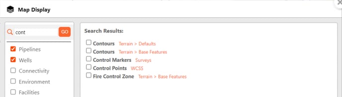 Use the Layer Search in the top-left corner of the Map Display menu to quickly search for and select from matching surface layer options. The orange text shows the location of each result.